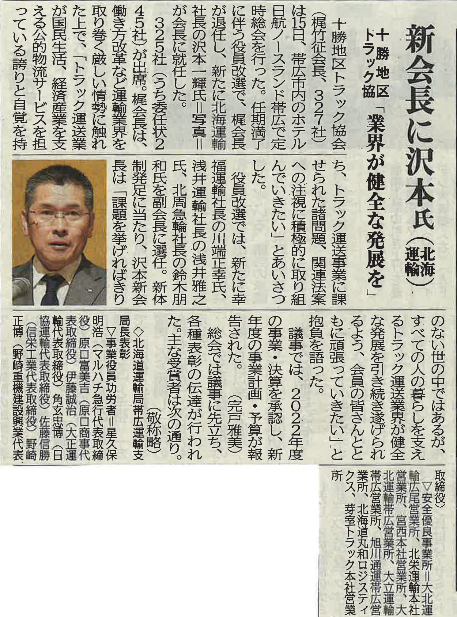 十勝地区トラック協会は5月15日に帯広市内で定時総会を行い、新たに当社沢本一輝社長が会長に就任いたしました。